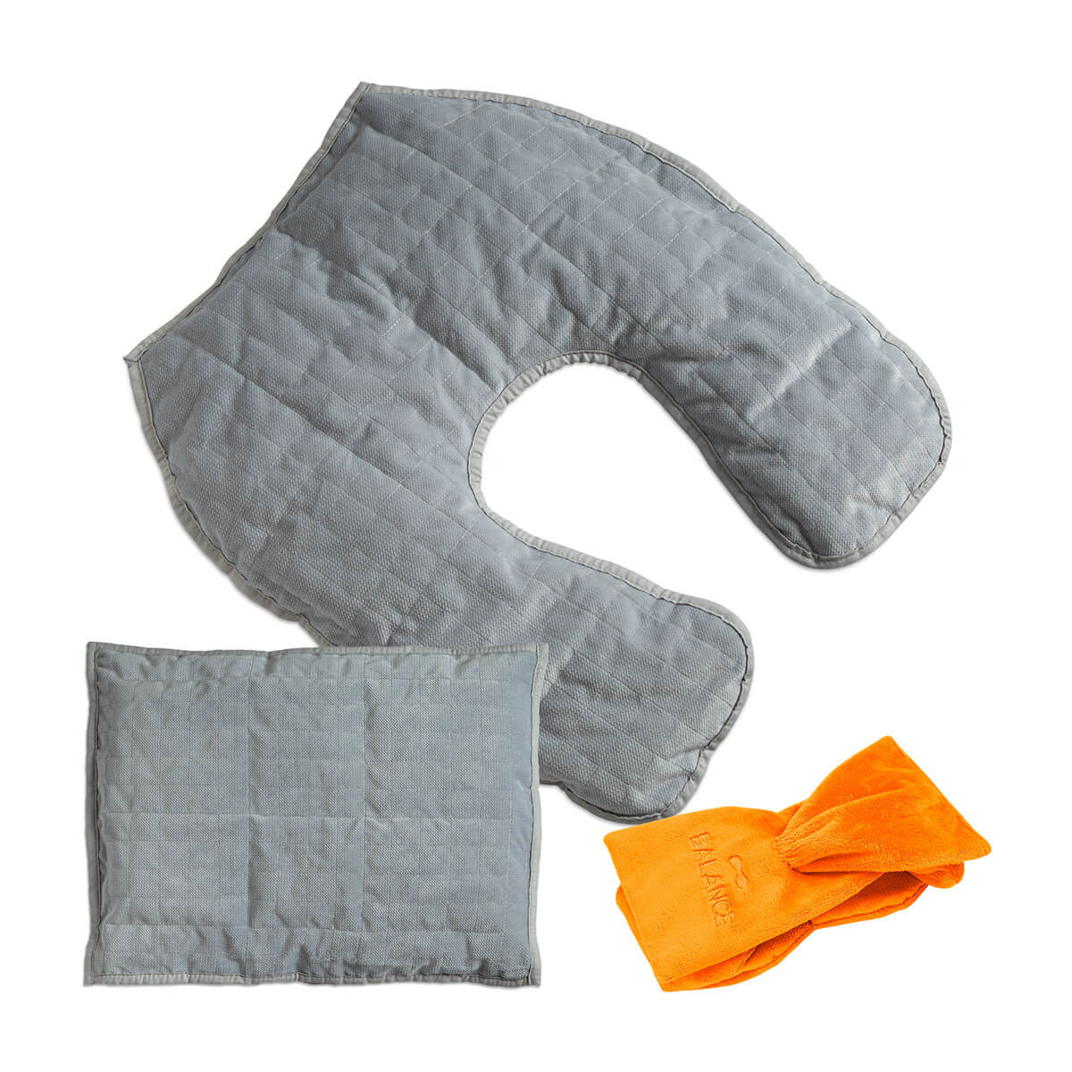 - 1 x verzwaarde schouderkussen - 1 x verzwaarde schootkussen - 1 x Balance® verzwaarde slaapmasker / hoofdband